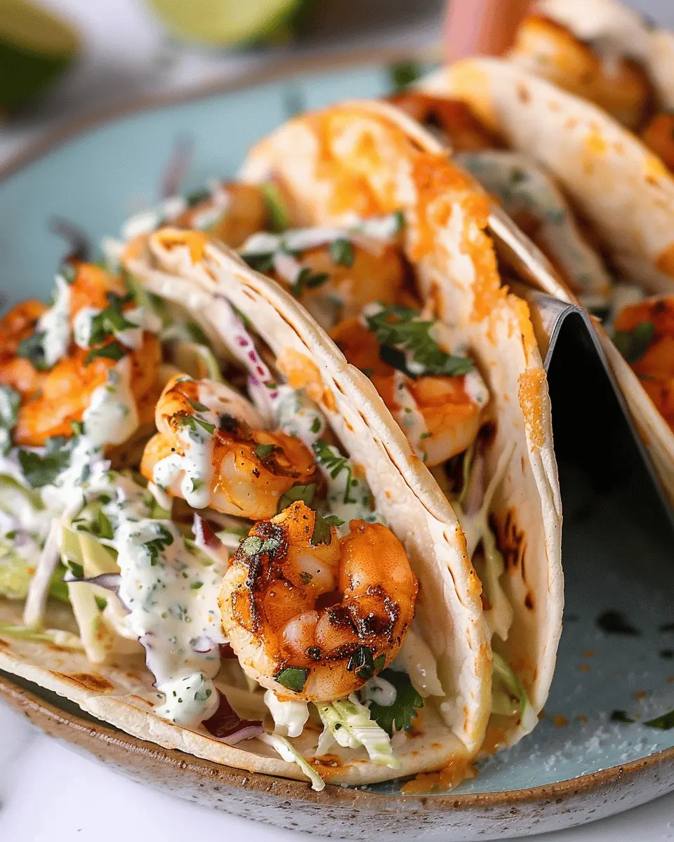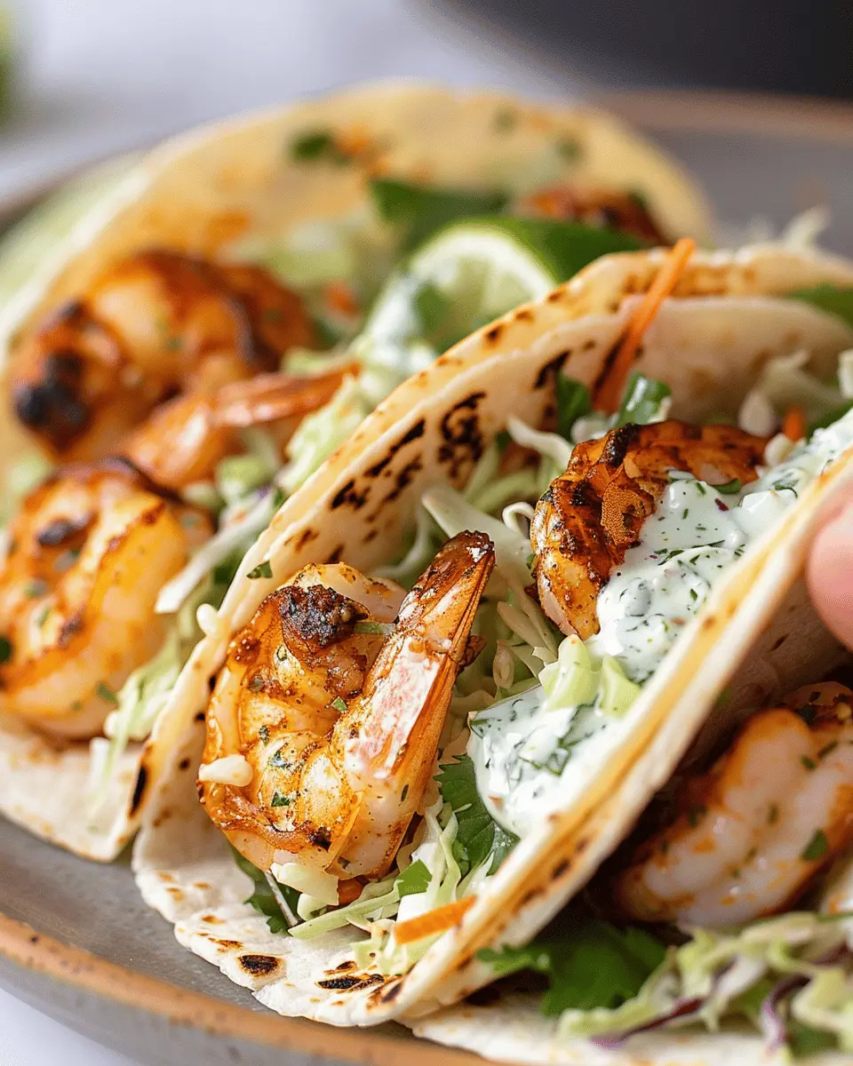 - Assemble the tacos by placing shrimp and creamy slaw in the tortillas.