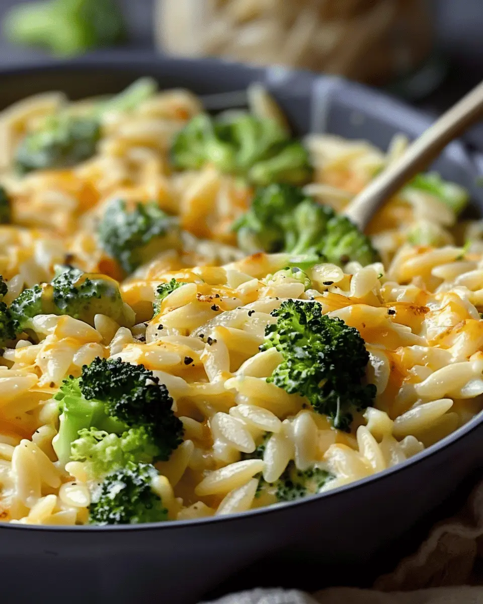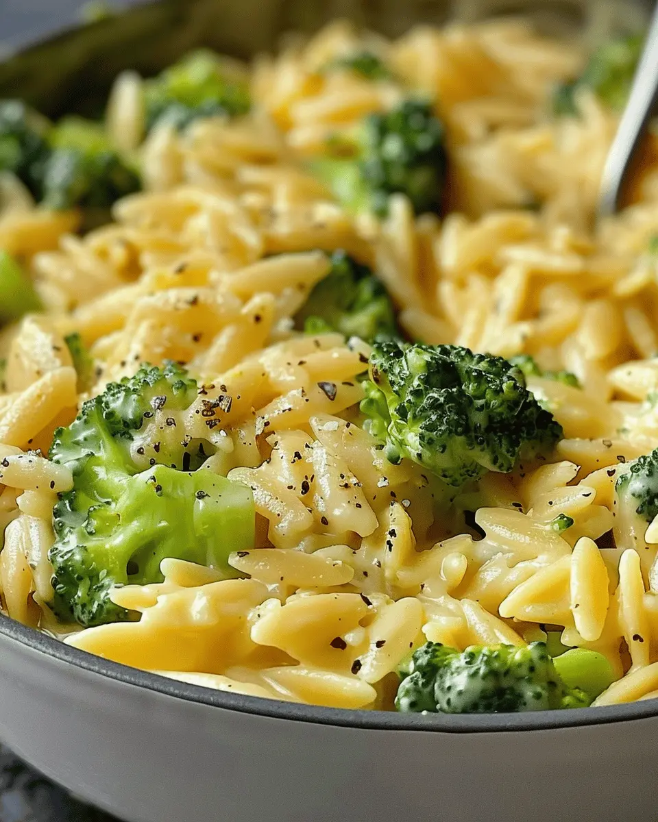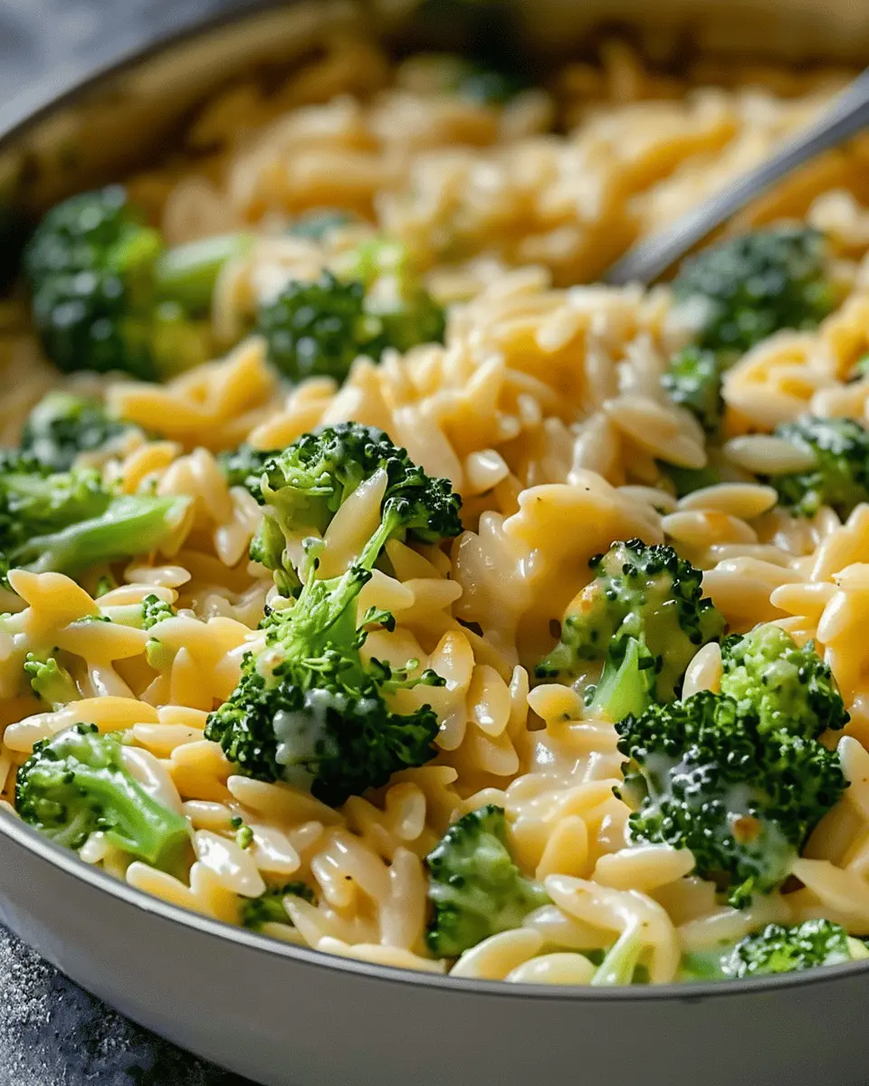 A delicious and creamy one-pot recipe that brings together broccoli and cheddar in a comforting orzo dish.