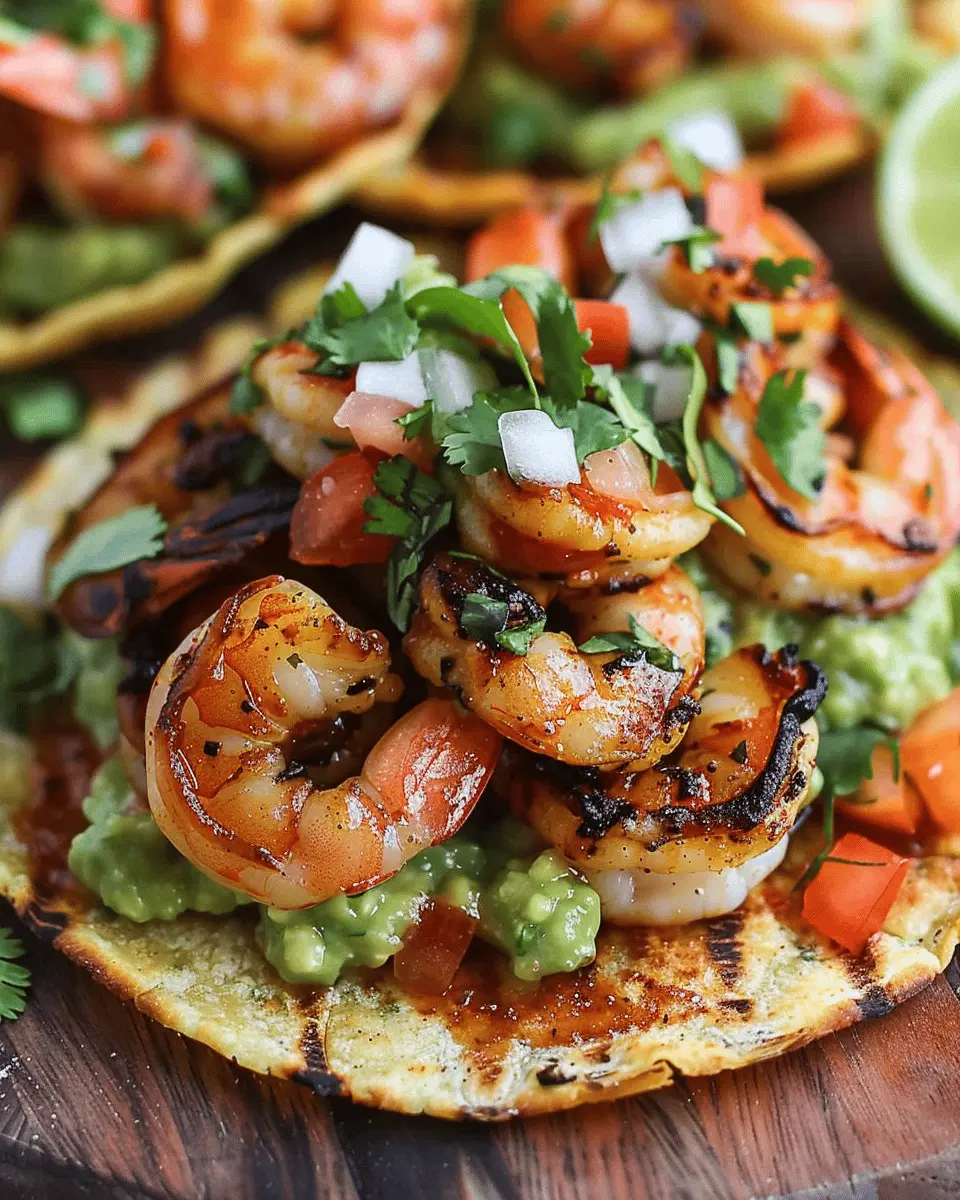 Enjoy fresh and vibrant flavors with these Grilled Shrimp Tostadas topped with creamy guacamole and zesty pico de gallo.
