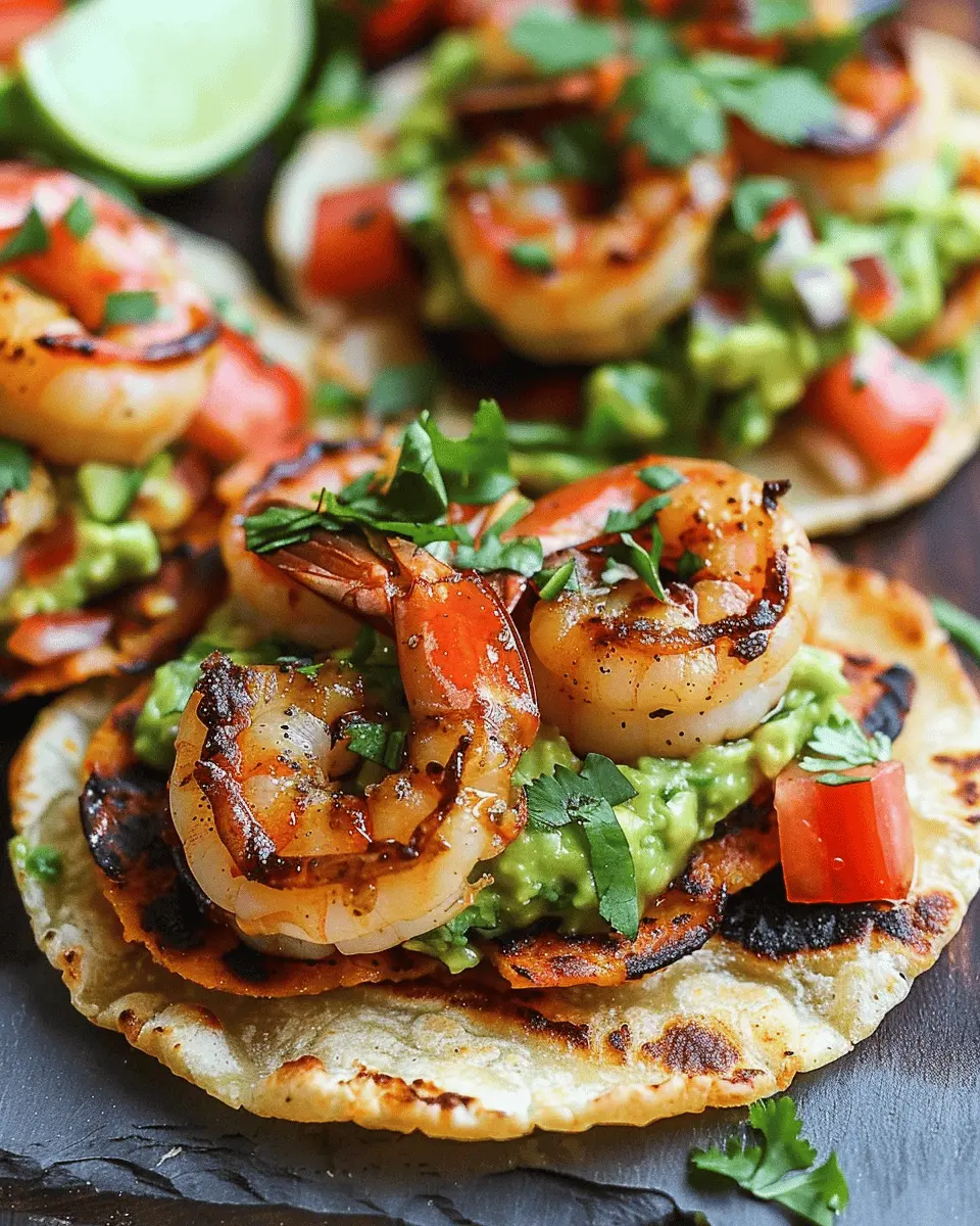 - Assemble tostadas by spreading guacamole on each tostada shell and topping with grilled shrimp.