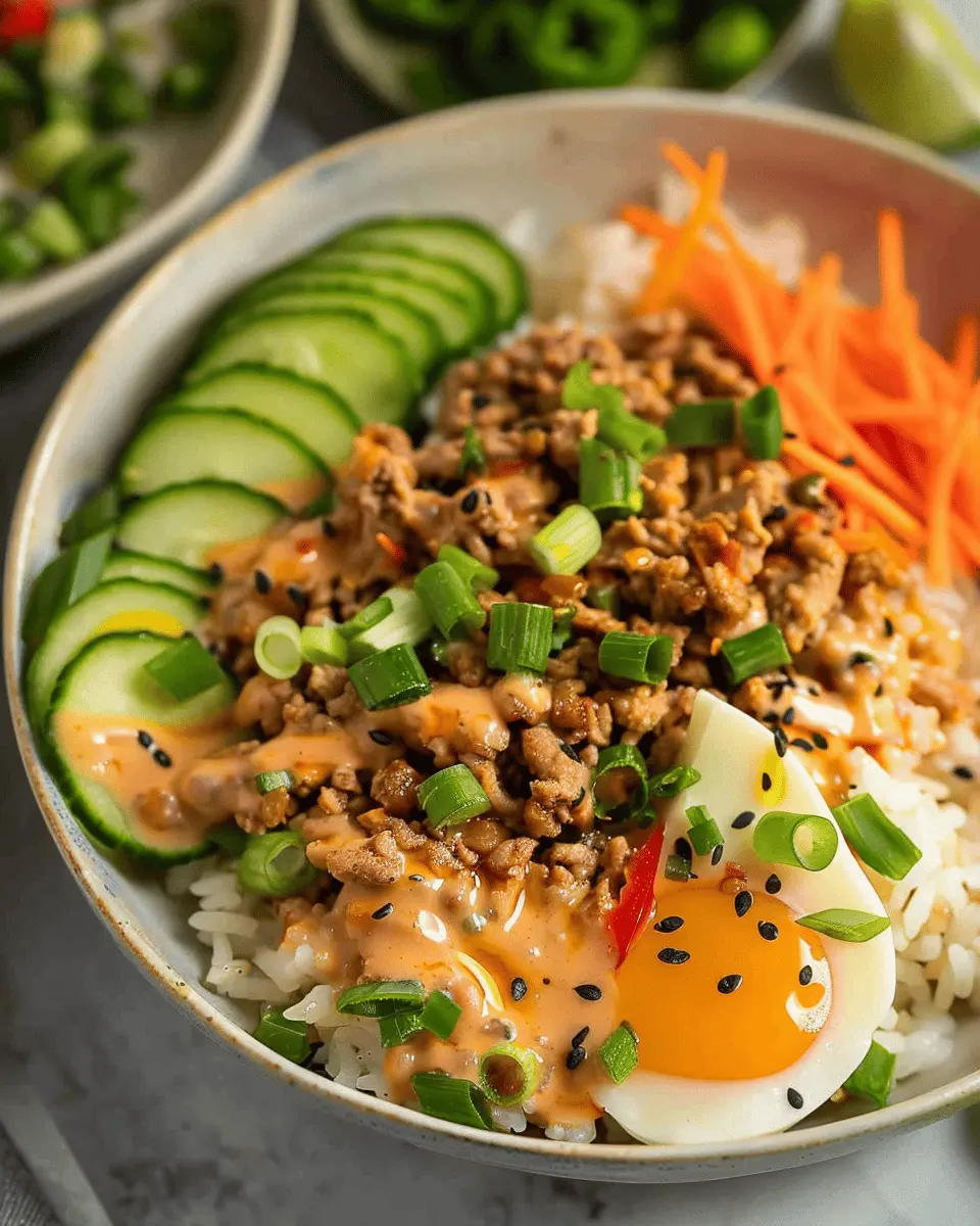 Start by placing a generous scoop of rice at the bottom of your bowl. Layer on that flavorful ground turkey mixture, then top it off with fresh vegetables and a drizzle of your homemade Bang Bang Sauce. Garnish with chopped green onions for an extra burst of color and flavor.